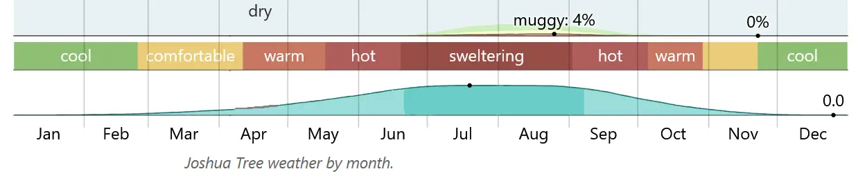 As for the rest of the year, the temperatures vary wildly here! Winters are cold, hovering around 32°F/0°C at night and averaging a high of 58°F/14°C without the wind chill factor. Spring (Mar – May) and autumn (Sep – Nov) are the best times to come to Joshua Tree (because the weather is gorgeous and fairly temperate), but that also means that the Park is busier